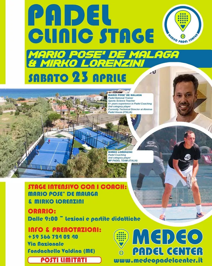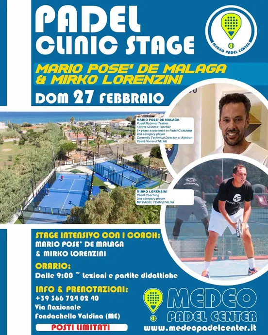 MEDEO PADEL CENTER  comunica che tra gli obbiettivi   dell’attività  del circolo c’è l’intento di migliorare le qualita’ tecnico/didattiche dei  propri sostenitori; per questo   ha organizzato una giornata esclusiva di studio con maestri Nazionali ed Internazionali.